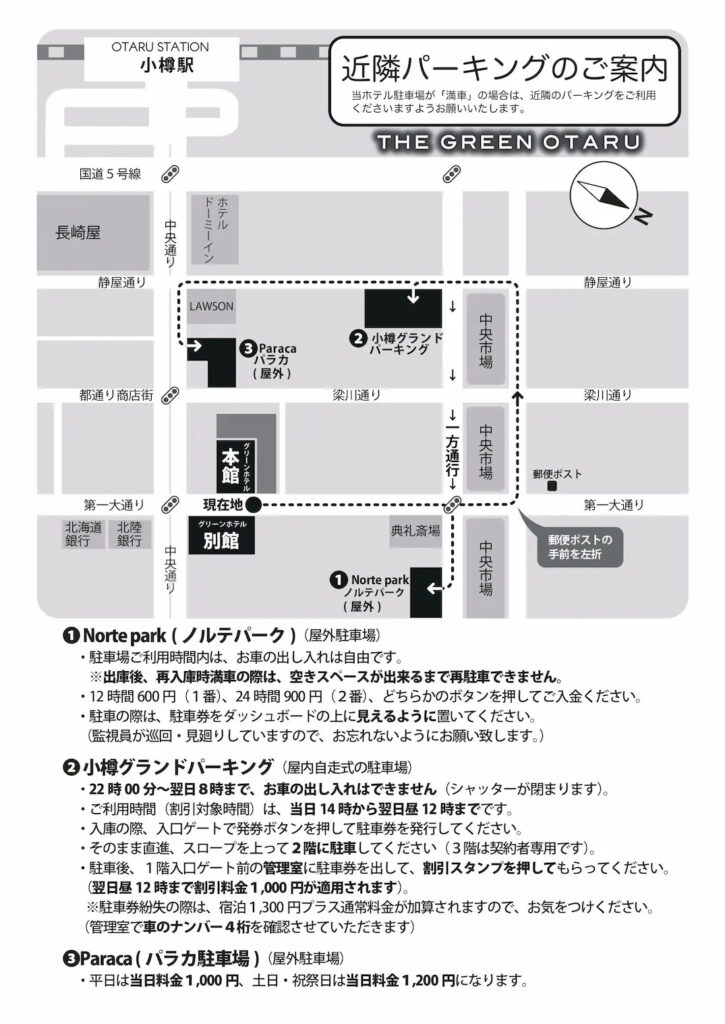 小樽グリーンホテルの駐車場(1泊1,500円先着順)をご利用ください。